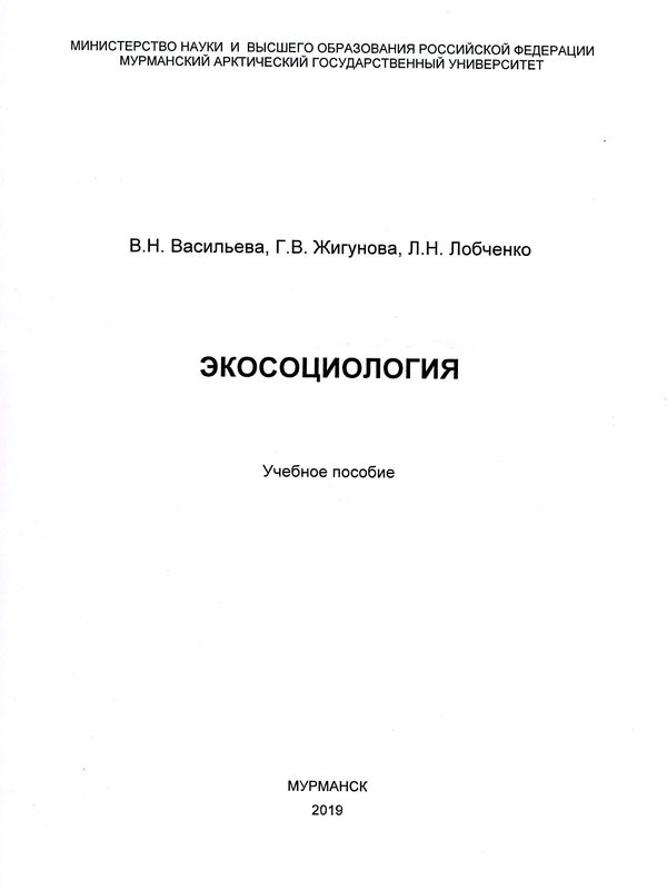 09.11.20Васильева, В. Н. Экосоциология : учебное пособие по дисциплине "Экосоциология" по направлению подготовки бакалавриата 39.03.01 "Социология" / В. Н. Васильева, Г. В. Жигунова, Л. Н. Лобченко; Министерство науки и высшего образования Российской Федерации, Мурманский арктический государственный университет. – Мурманск : МАГУ, 2019. – 179 с.