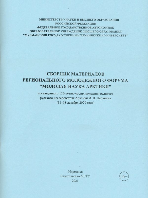 13.09.21Сборник материалов регионального молодежного форума "Молодая наука Арктики", посвященного 123-летию со дня рождения великого русского исследователя Арктики И. Д. Папанина (Мурманск, 11-18 декабря 2020 года) / Министерство науки и высшего образования Российской Федерации, Федеральное государственное автономное образовательное учреждение высшего образования "Мурманский государственный технический университет". – Мурманск : Издательство МГТУ, 2021. – 75 с. : ил. – ISBN 978-5-907368-26-2 : 129-77. – Текст : непосредственный.