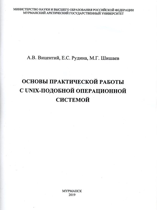 13.10.20Вицентий, А. В. Основы практической работы с UNIX-подобной операционной системой : учебное пособие по дисциплине "Операционные системы" по направлению подготовки 09.03.02 "Информационные системы и технологии" / А. В. Вицентий, Е. С. Рудина, М. Г. Шишаев; Министерство науки и высшего образования Российской Федерации, Мурманский арктический государственный университет. – Мурманск : МАГУ, 2019. – 96 с.