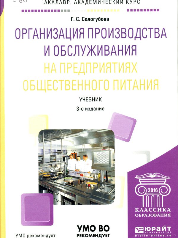 13.10.20Сологубова, Г. С. Организация производства и обслуживания на предприятиях общественного питания : учебник для академического бакалавриата : для студентов высших учебных заведений, обучающихся по экономическим и техническим направлениям, по специальности "Экономика и управление на предприятии туризма" / Г. С. Сологубова. – 3-е изд., испр. и доп. – Москва : Юрайт, 2019. – 330, [2] с.