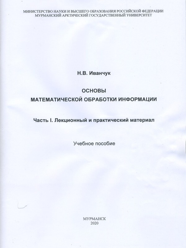 23.12.21Иванчук, Н. В. Основы математической обработки информации. Часть 1. Лекционный и практический материал : учебное пособие / Н. В. Иванчук; Министерство науки и высшего образования Российской Федерации, Мурманский арктический государственный университет. – Мурманск : МАГУ, 2020. – 92 с. – Библиогр.: с. 89-90. – ISBN 978-5-4222-0430-8 : 100-00. – Текст : непосредственное.
