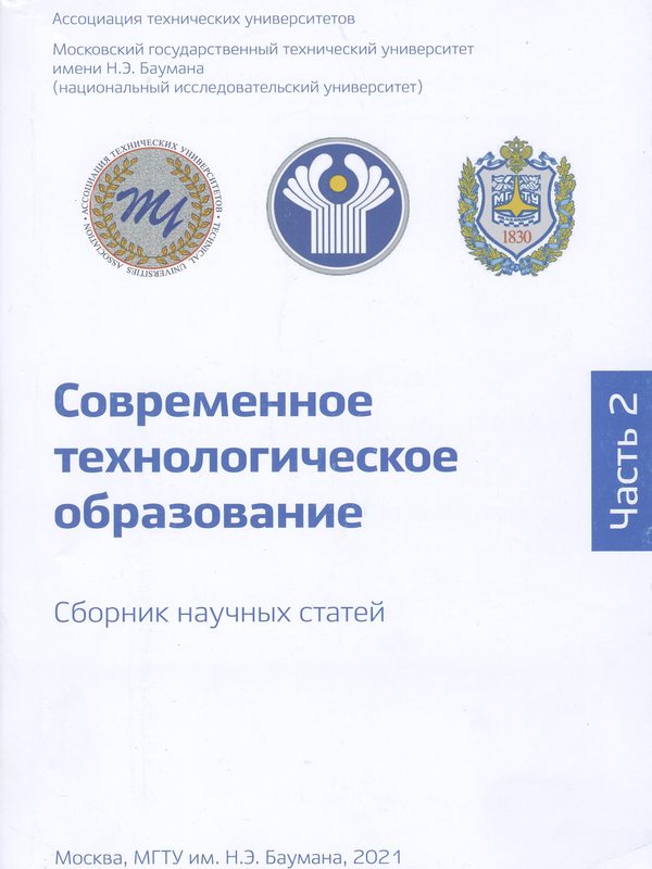 28.12.21Современное технологическое образование : сборник научных статей. Ч. 2 / Ассоциация технических университетов ; Московский государственный технический университет имени Н. Э. Баумана (национальный исследовательский университет) ; редактор-составитель В. К. Балтян. – Москва : МГТУ им. Н. Э. Баумана, 2021. – 293 с. : ил. – Библиогр. в конце ст. – ISBN 978-5-91916-041-0 : 220-00. – Текст : непосредственное.