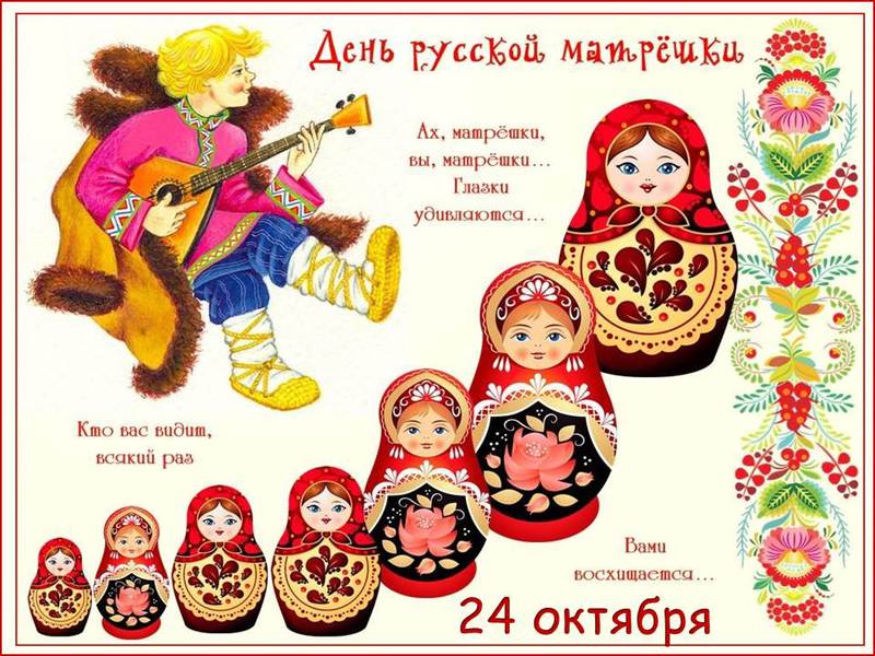 24.10.2224 октября 1900 года на Всемирной выставке в Париже посетители впервые увидели необычную игрушку. Румяная кукла Матрена, крепко держащая подмышкой бойкого петуха, открывалась – и из нее появлялась еще одна яркая кукла, а за ней еще, и еще, и так до восьми фигурок. Нарекли куклу матрешкой (производное от имени Матрена, которое было весьма тогда популярным среди русских крестьянок).