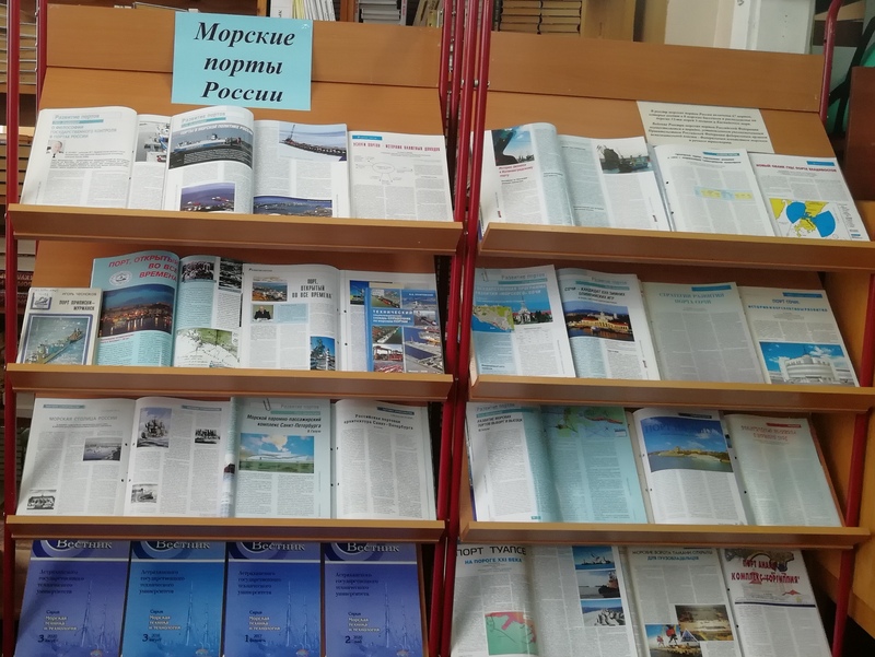 На книжной выставке "Морские порты России" представлена литература о портах Мурманск, Калининград, Сочи, Санкт-Петербург и др.